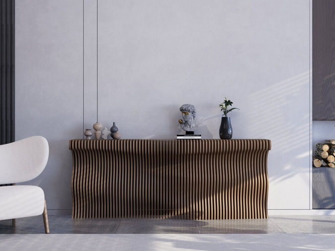 Grâce à une découpe numérique (CNC), cette console présente un motif fluide et organique qui joue avec la lumière et les ombres, apportant une touche dynamique à l’espace.